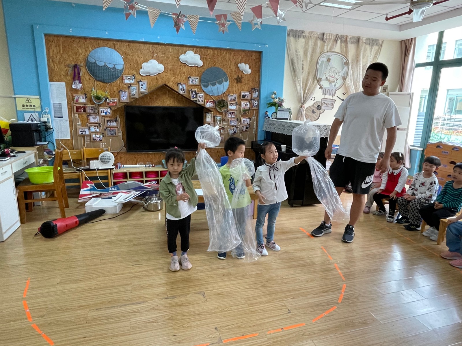 在表演开始前,老师根据实物为幼儿讲解飞机的外观、结构,并且通过有趣的实验: 空气大力士、听话的球、空气炮、干冰秀等帮助幼儿了解飞机飞行的原理。