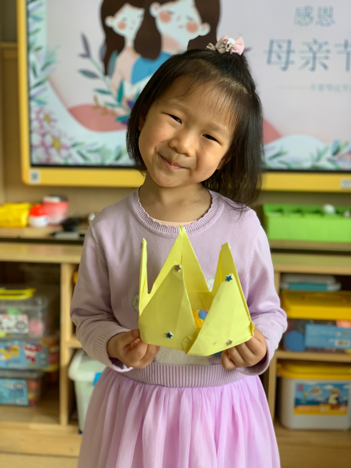 中班幼儿讨论“我的妈妈长的什么样子”并通过折纸活动送给妈妈花、心愿盲盒、女王的皇冠、包包等,孩子们体会到妈妈辛苦,学会了关心、照顾妈妈。