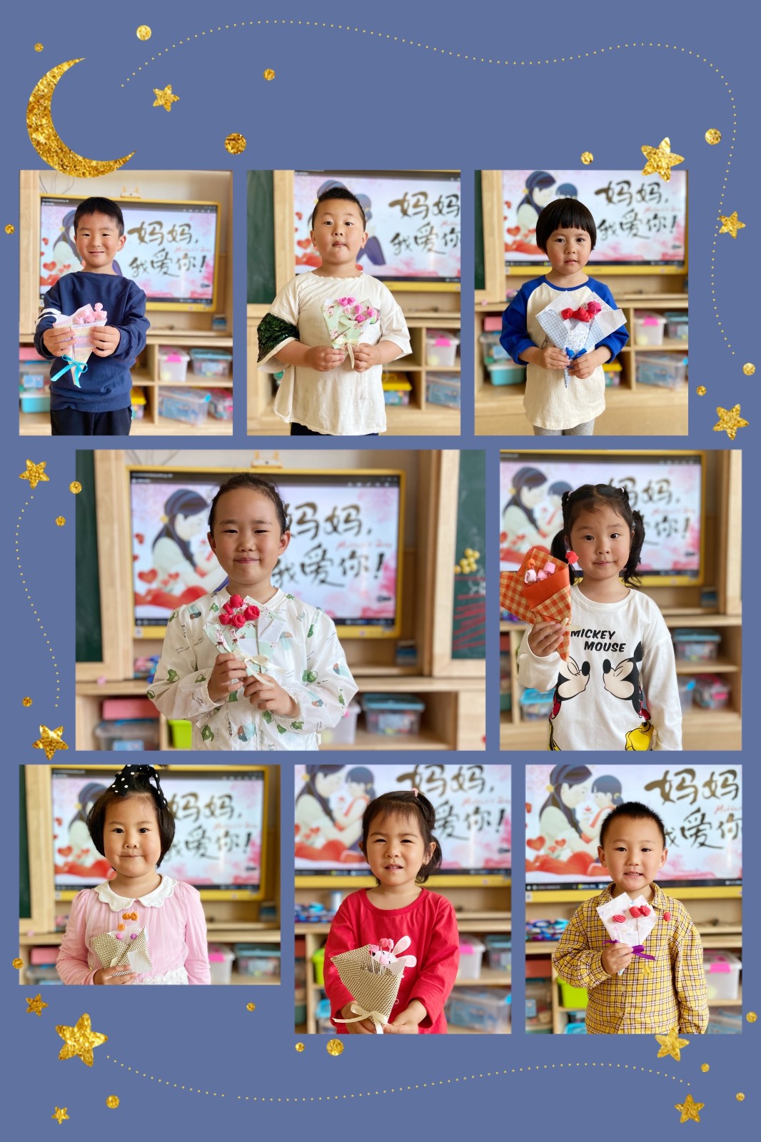 小二班的孩子们通过手指点画,制作了美丽的花束送给自己的母亲当礼物,各色包装纸上绽放着五颜六色的花朵,表达了幼儿对母亲纯真的爱!