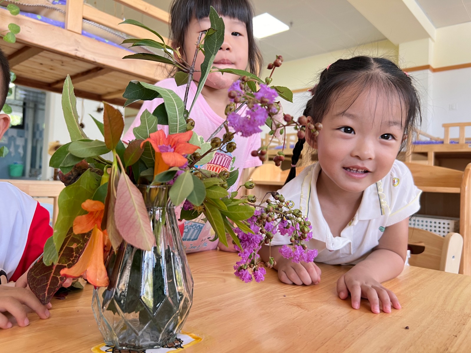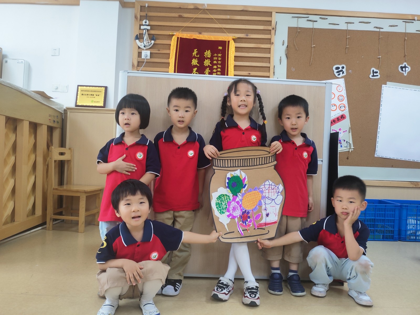 送给你小心心,送你花一朵,你在我生命中,太多的感动,你是我的天使,一路指引我……”中班的孩子们以花香,致匠心,创造出了绚丽芬芳、新颖别致的作品,阐释了教师的匠心,这是无声的诗、也是立体的画……