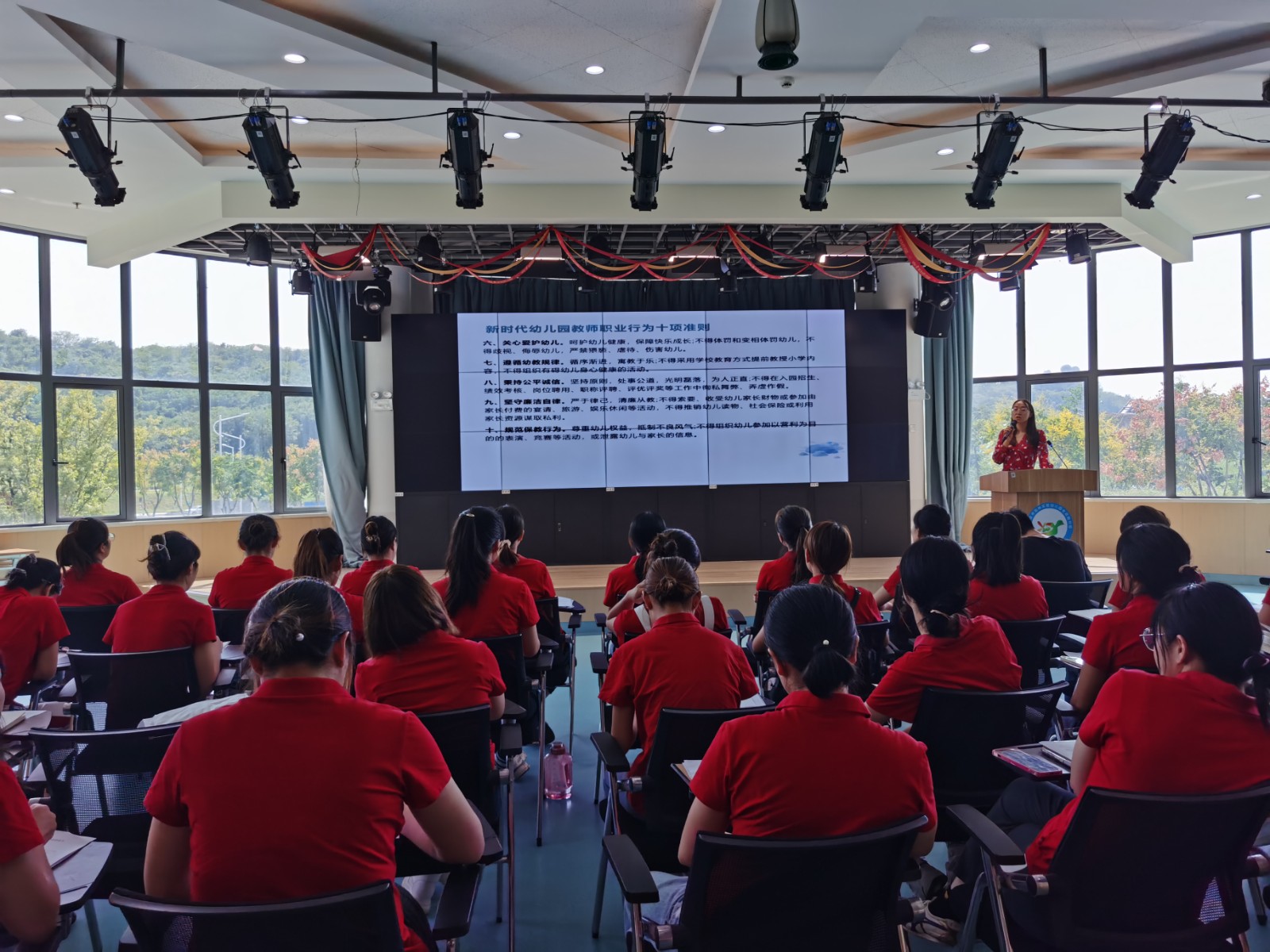 为进一步加强教师队伍建设,落实立德树人的根本任务,全面提高教师履行工作职责的能力。教师节前夕,光启路分园以迎接党的二十大,培根铸魂育新人为主题的师德师风专题培训活动顺利进行。培训中,执行园长王愫结合典型案例就《新时代幼儿园教师职业行为十项准则》《幼儿园教师违反职业道德行为处理办法》进行了详细的解读和分享。教师们仔细聆听认真记录,从自身角度进行了深刻的反思。