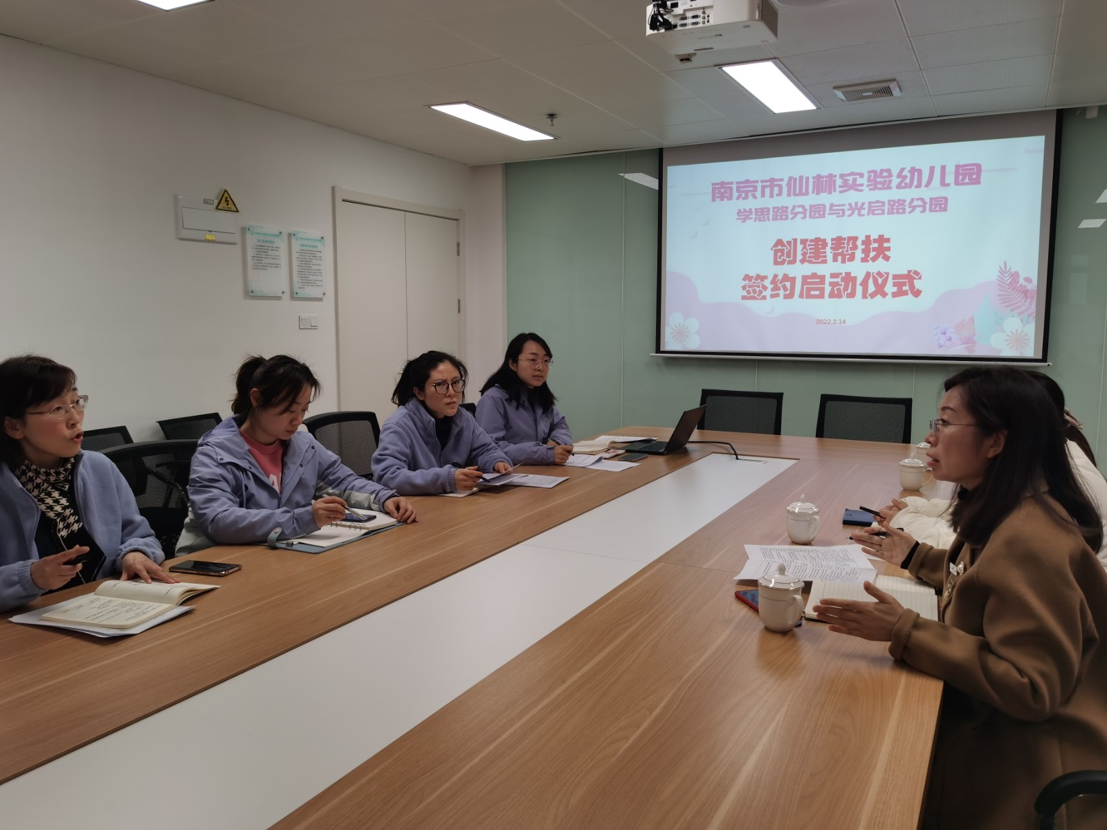 为加强幼儿园之间双向沟通,提升集团整体办园水平和保教质量,2022年2月14日下午,南京市仙林实验幼儿园光启路分园邀请学思路分园来园,开展共建帮扶协议签约启动仪式。