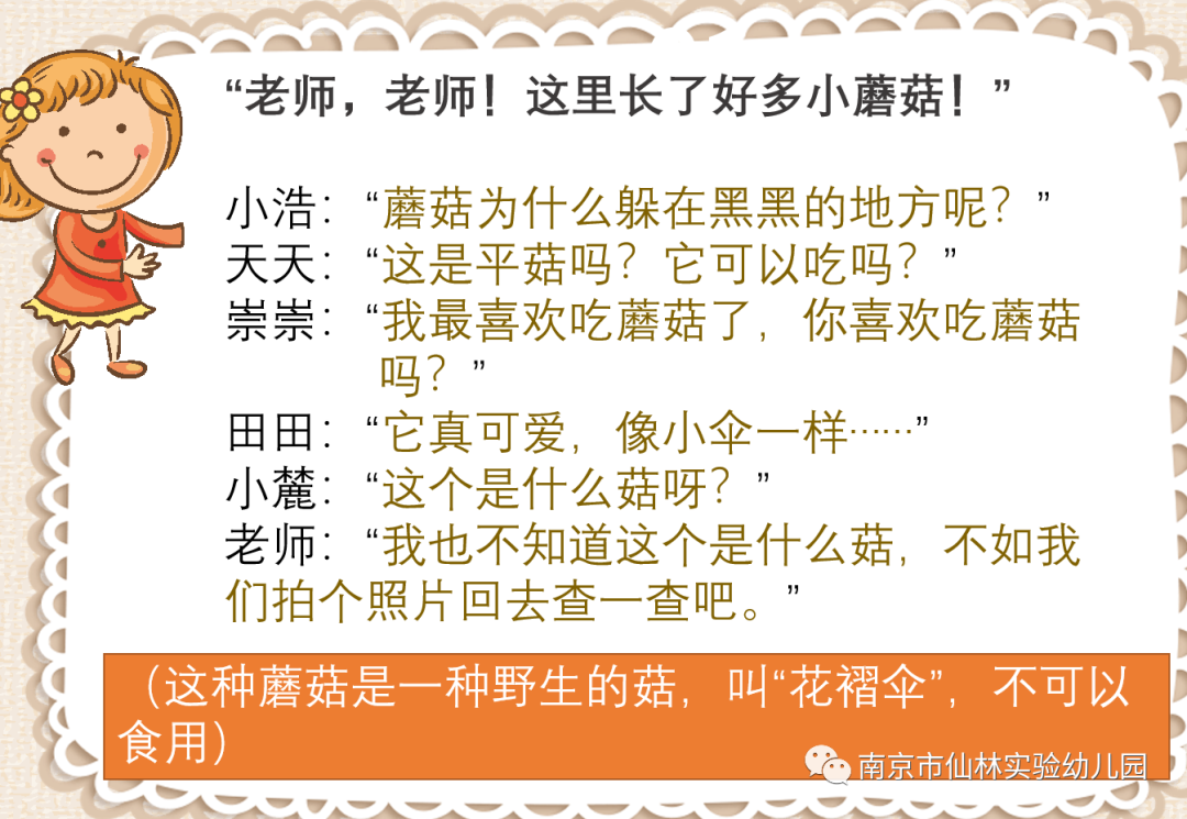 3.在班级其实会有一些孩子并不爱吃蘑菇,带着一份关注蘑菇4.成长过程中种种的发现和喜悦,他们回家后会有怎样的表现呢?