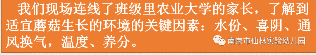 《指南》健康领域中有提到:帮助幼儿了解事物的营养价值,引导他们不偏食不挑食。结合生活教育理念,孩子们了解蘑菇,养护菇菇,把和菇菇在一起的各种美好回忆都转化成对菇菇多一份喜爱。我们欣喜地发现在每次午餐中出现蘑菇,孩子们都抢着说我想多吃一点,真正喜欢上吃蘑菇。