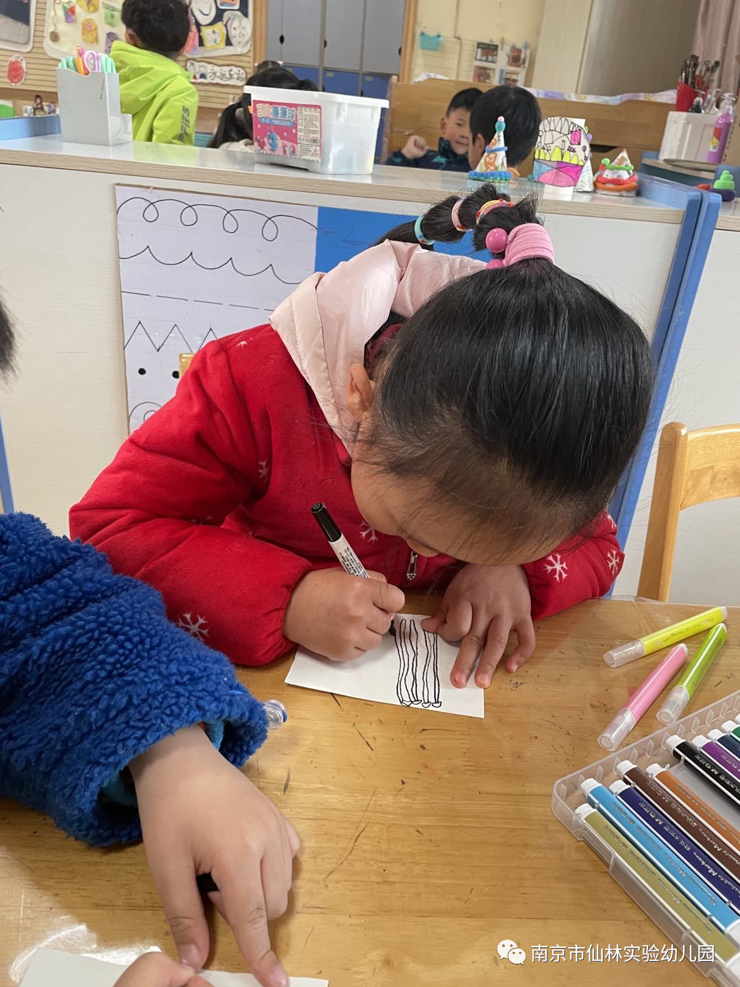 (美工区里孩子们对蘑菇进行想象创造)