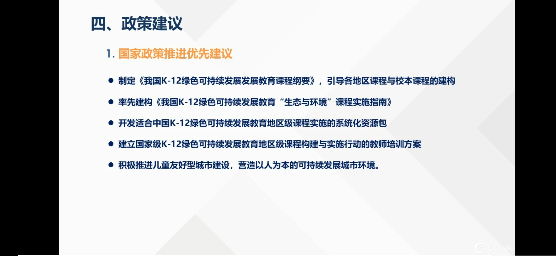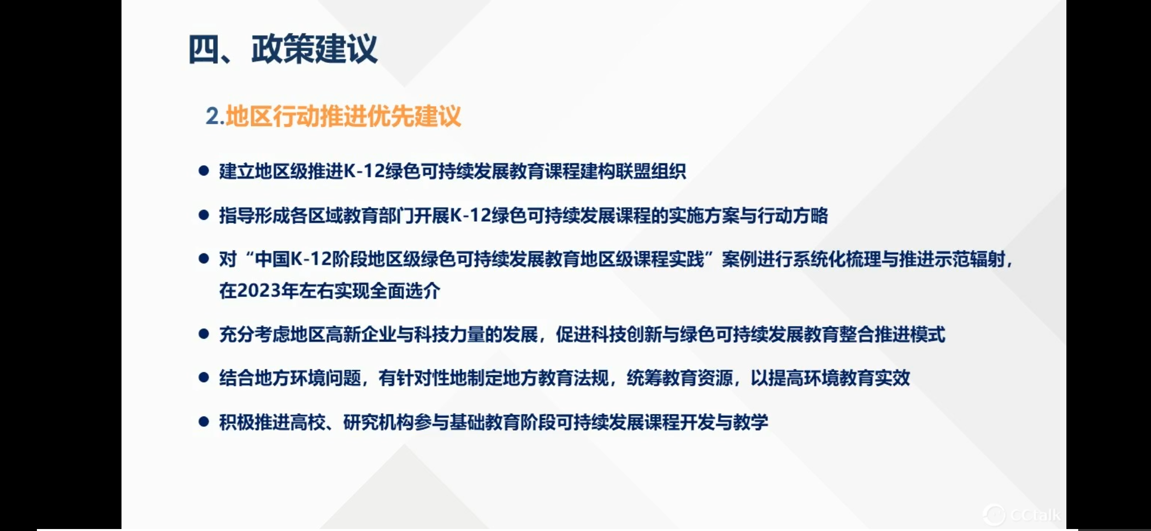 本次讲座围绕可持续发展教育地区级别的课程构建思路与行动建议,从研究的过程、构建思路,四个领域行动建议以及政策建议等四个方面向我们介绍了相关知识和探索经验。