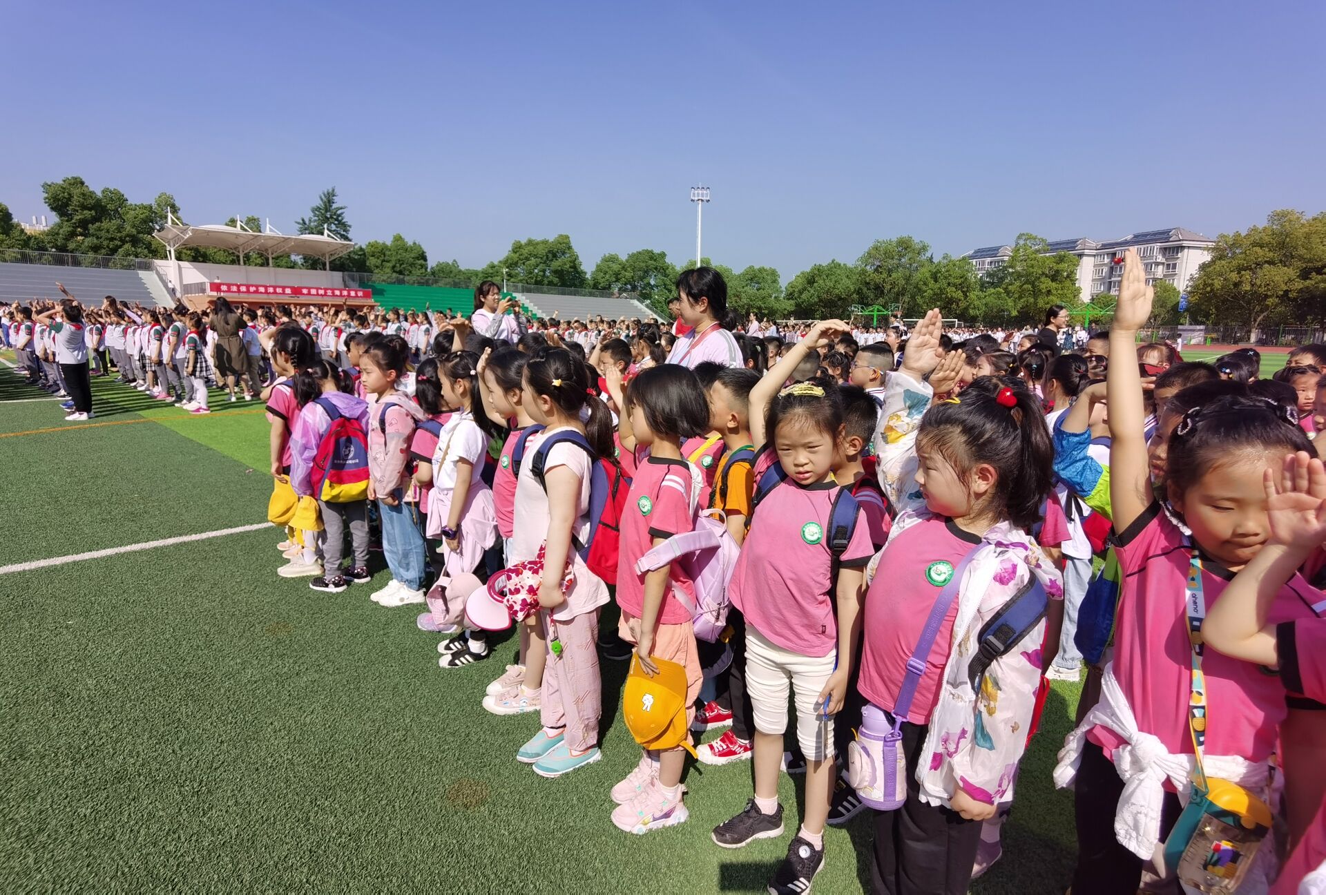 伴随着朝阳,大班幼儿与小学生同站在一片绿茵场地,学着小学的哥哥姐姐们,站姿笔直,敬队礼,双眼凝视着鲜艳的国旗在雄壮的国歌声中缓缓升起,感受小学庄严的升旗仪式。