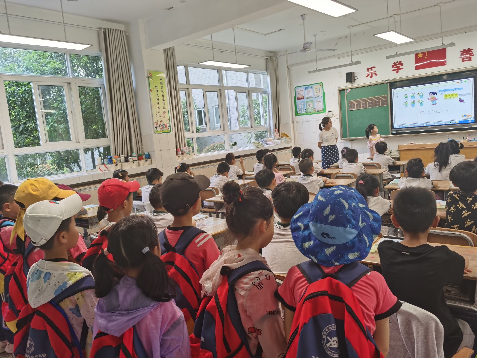 升旗仪式后,大班幼儿安静地走进小学一年级的教室,观摩与幼儿园有所不同的教学活动。孩子们看着哥哥姐姐们端正的坐姿,大胆踊跃地发言,更加激发了他们想成为一名光荣的小学生的愿望!