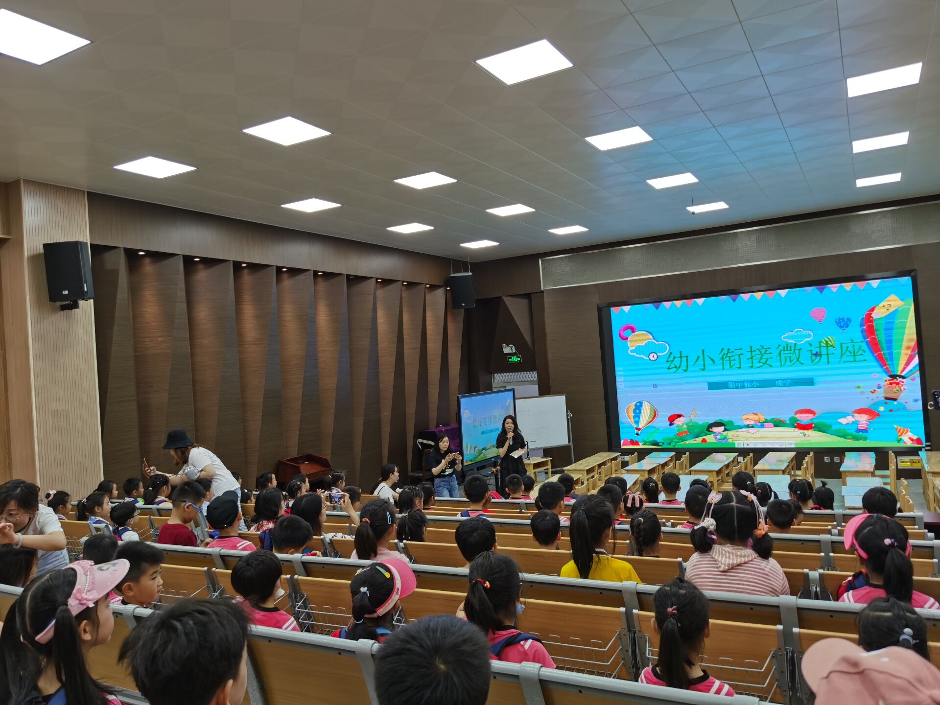 仙林小学的老师们精心为孩子们准备了一场幼小衔接方面的微讲座。通过一段视频,大家对于仙林小学丰富多彩的生活首先有了一个初步的了解;通过讲座,孩子们还学会了课堂上的坐姿、如何举手发言等。