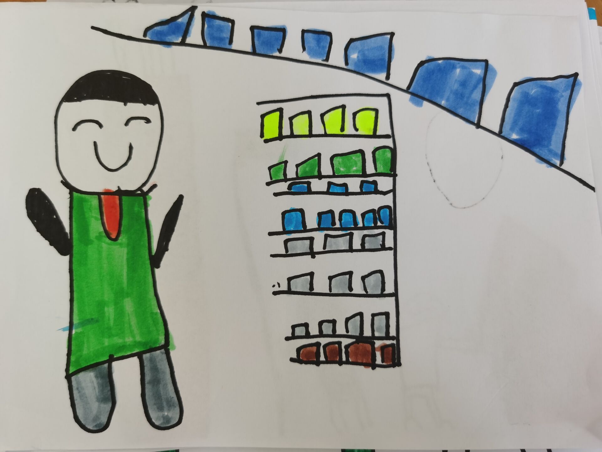 回到幼儿园后,孩子们在区域游戏中迫不及待地记录着在小学的新奇发现:小学的楼房有四层,比幼儿园要高一层;小学的洗手间男、女生是分开来的;小学每一层楼都有接水的饮水机;教室里每一个小学生都有属于自己的课桌椅.......