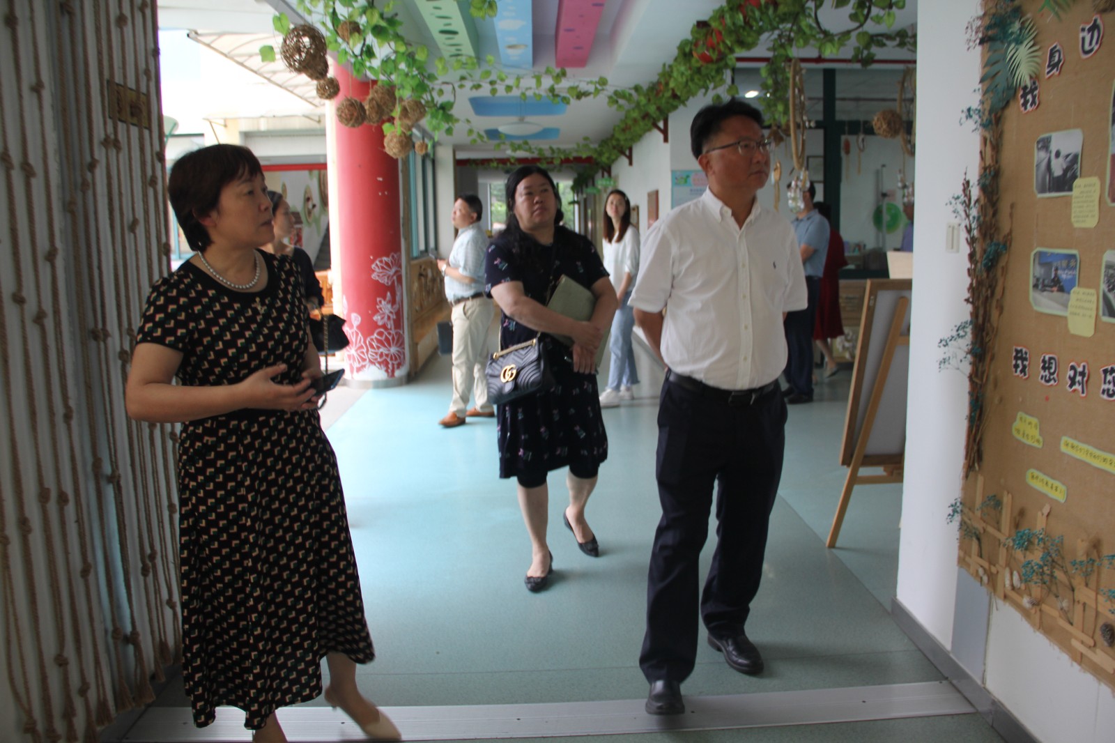 紧接着,考核小组一行移步仙实幼总园,现场查看园所环境。正值假期,校园里格外宁静,随处可见的自然物充满了浓厚的生活气息,花草、贝壳、枝叶……正如幼儿园文化墙上的“悦.美”二字里所蕴含的办园理念——引导孩子从自然界、社会生活及艺术作品中,感受美、表现美、创造美。