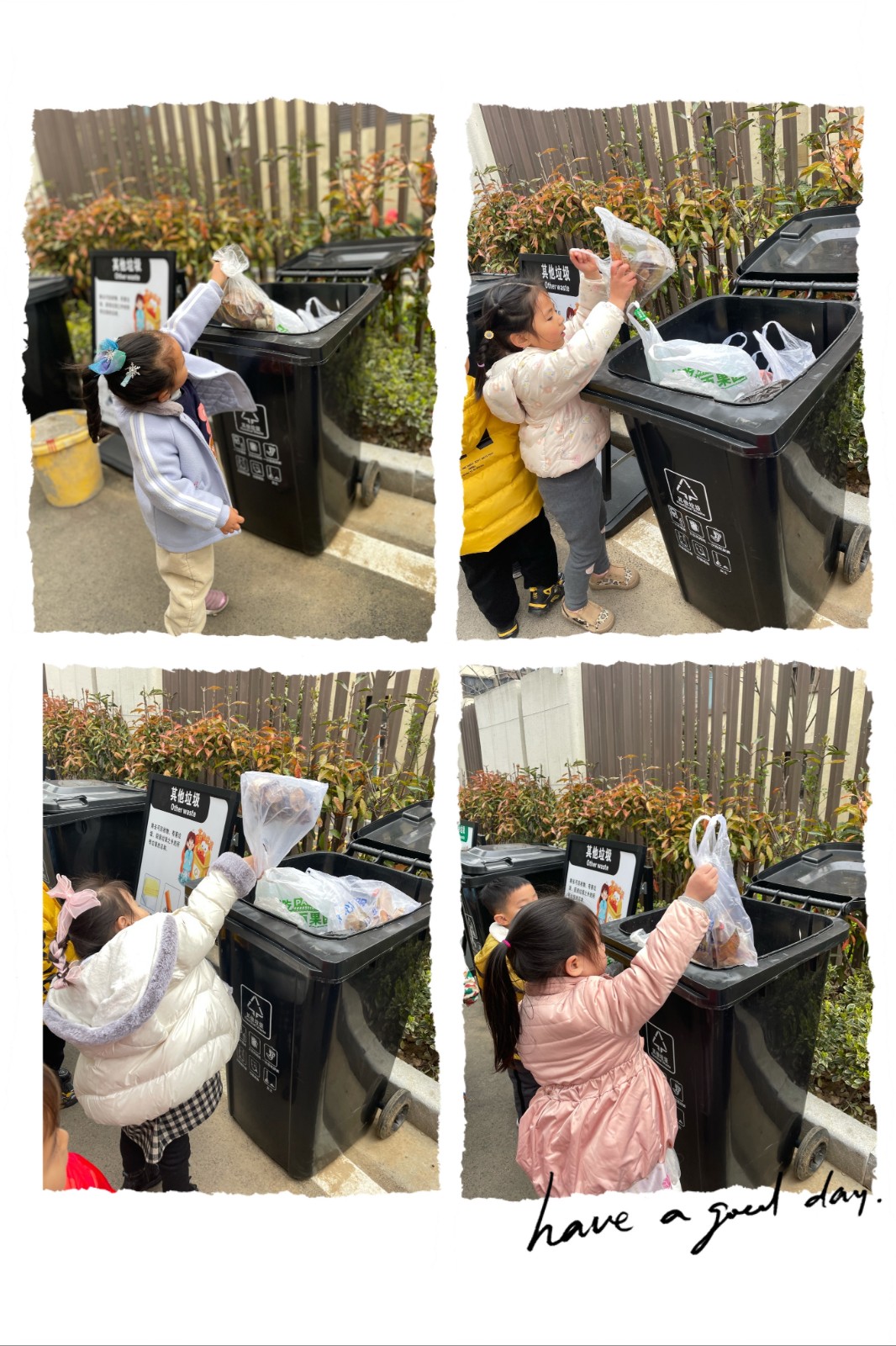 瞧,小宝贝们在老师的带领下积极地擦拭幼儿园的桌椅和体育玩具呢,还有的小朋友手拉手一起将地面的落叶捡了起来,根据垃圾的分类投放进入“其他垃圾”的垃圾桶。幼儿园在老师和小朋友们的齐心协力下变得焕然一新!