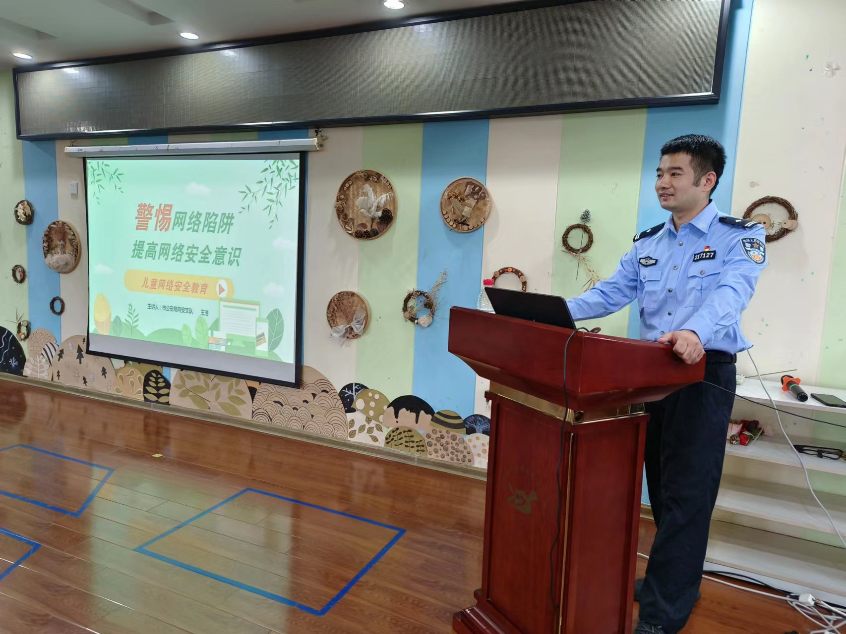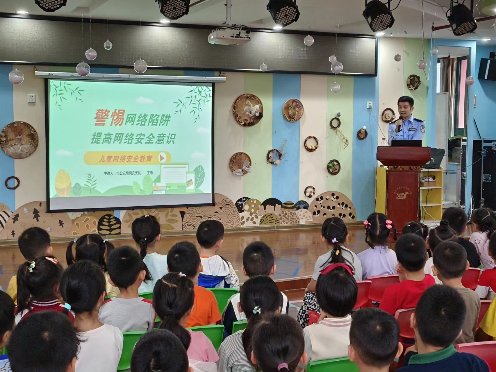活动中,王警官首先通过生动形象的图片和视频介绍了互联网的作用。对于小朋友来说,网络可以用来阅读绘本、看动画片、听故事,给我们的学习、生活带来了便利。同时也知道了网络有安全隐患,例如病毒攻击、红包陷阱、免费wifi等等,教育小朋友们不能泄漏个人信息,不信谣、不传谣,从自身做起,遵守网络安全准则,注意网络安全事项,提高网络安全意识和自我保护意识。王警官组织孩子们一起观看了《网络安全教育》视频,引导孩子们如何安全、科学的运用网络。