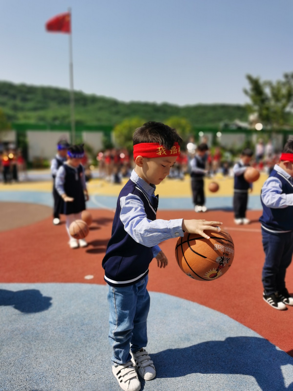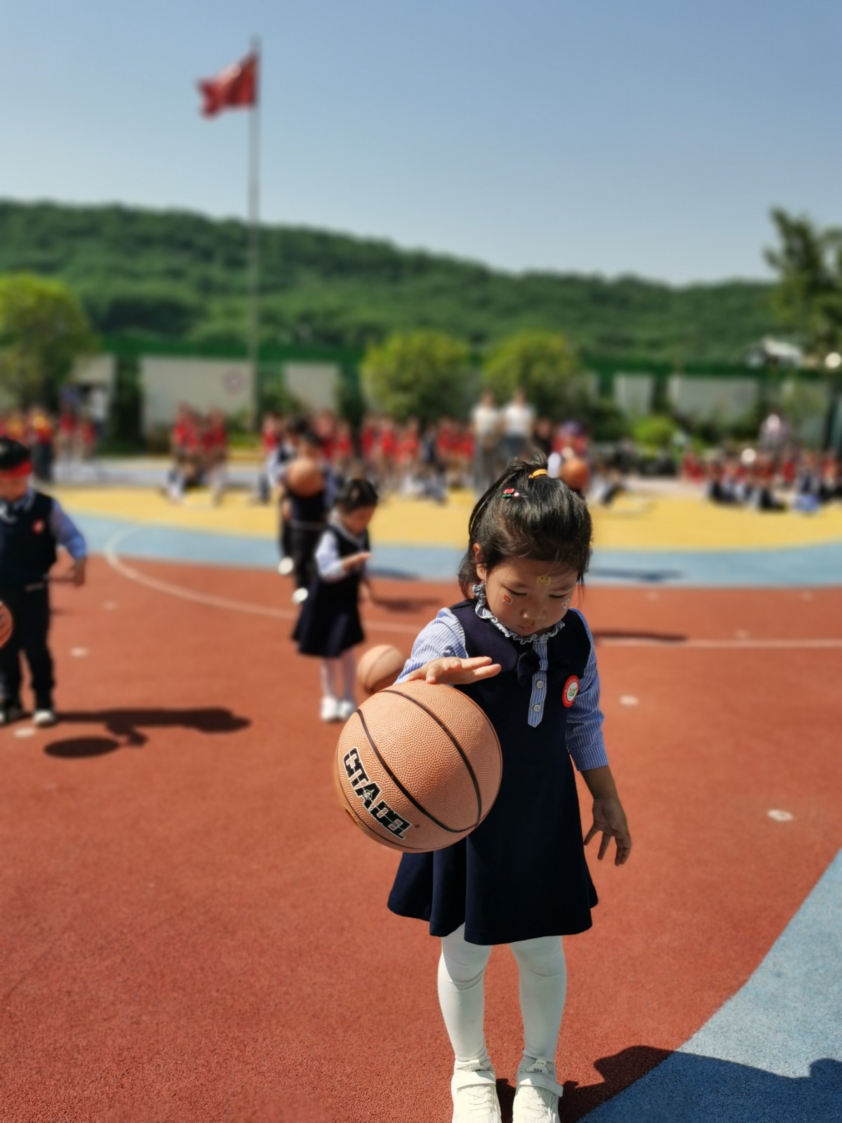 拍球能充分锻炼幼儿身体的各个部位,全面有效地提高综合身体素质,小班孩子们用小手灵活地控制着篮球,圆鼓鼓的球在他们手中就如同一个个“弹跳小精灵”。