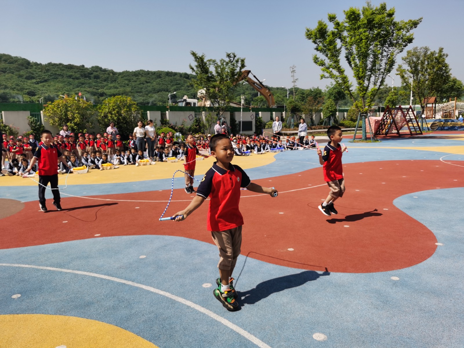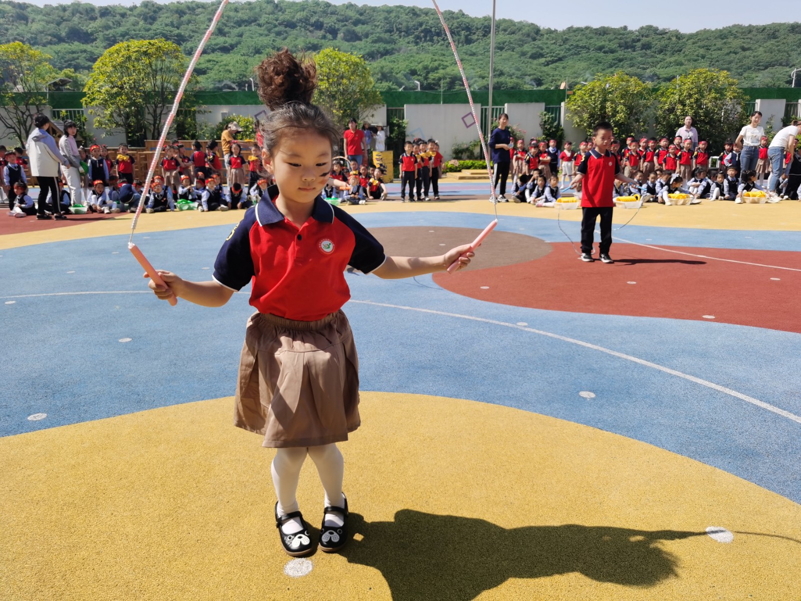 跳绳是一项时尚、健康的有氧运动,大班的小朋友们动作敏捷,跳绳飞快越过头顶,小脚迅速跳起又落下,充分展现了健康向上、不断挑战自我的运动精神。