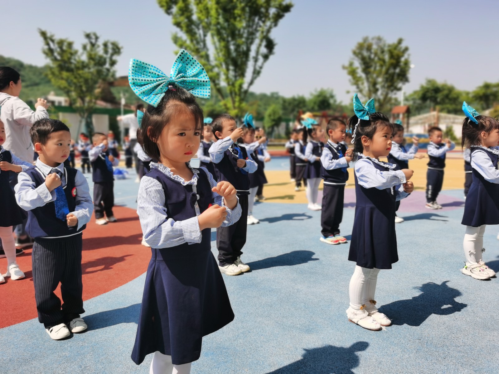 大班年级组以武术操为特色。沉浸在《功夫》的音乐中,孩子们劲头十足,动作干净利落,完美的阐释了武术的精、气、神,新颖的编排和充满活力的展示,呈现了孩子们强壮的体魄和集体的风采。