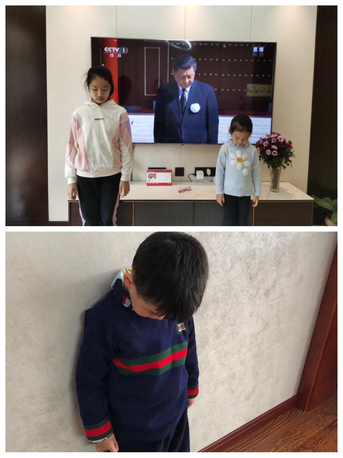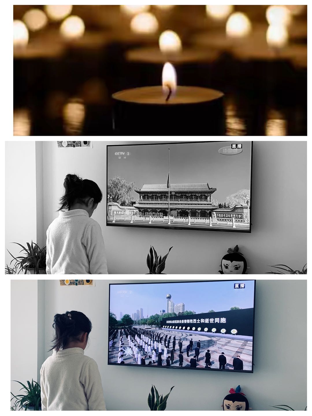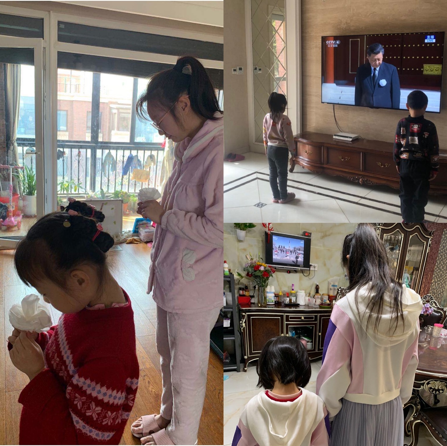 同样因为疫情不能上班的教师们,放下手中的各种家务事默哀,表达抗击新冠肺炎疫情斗争烈士和逝世同胞的深切哀悼。