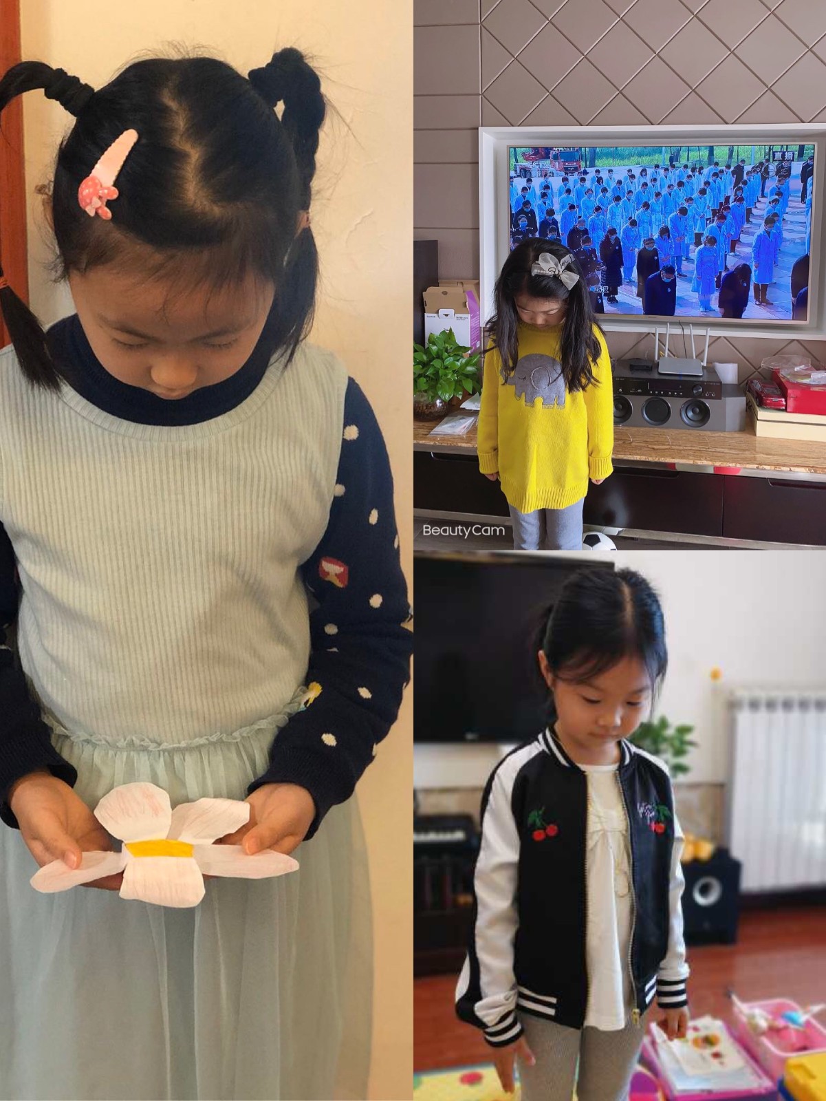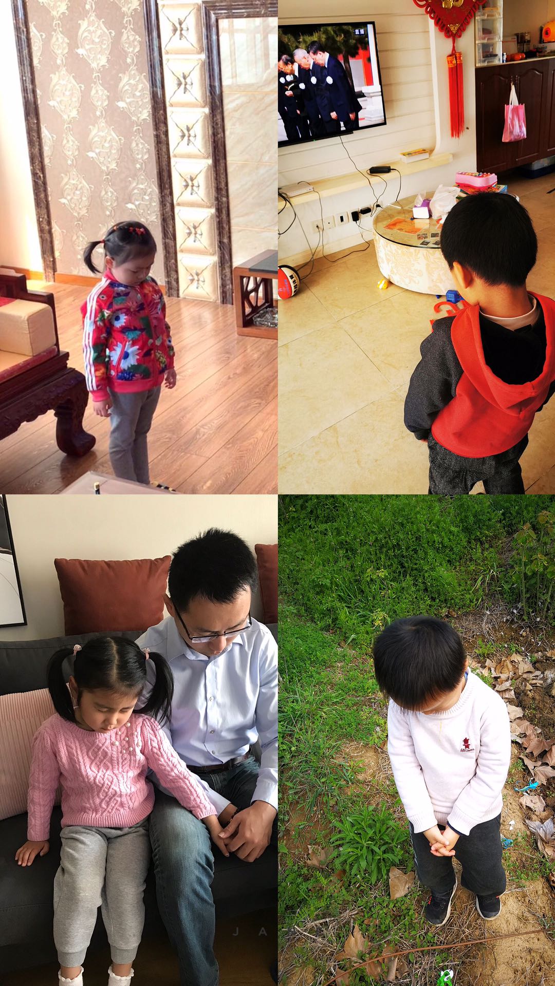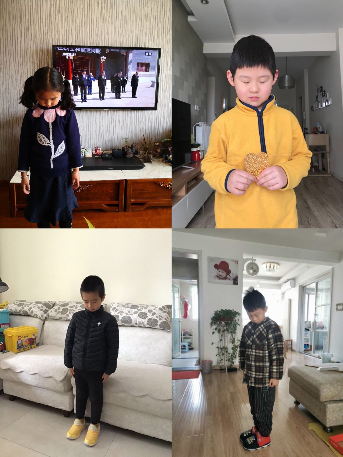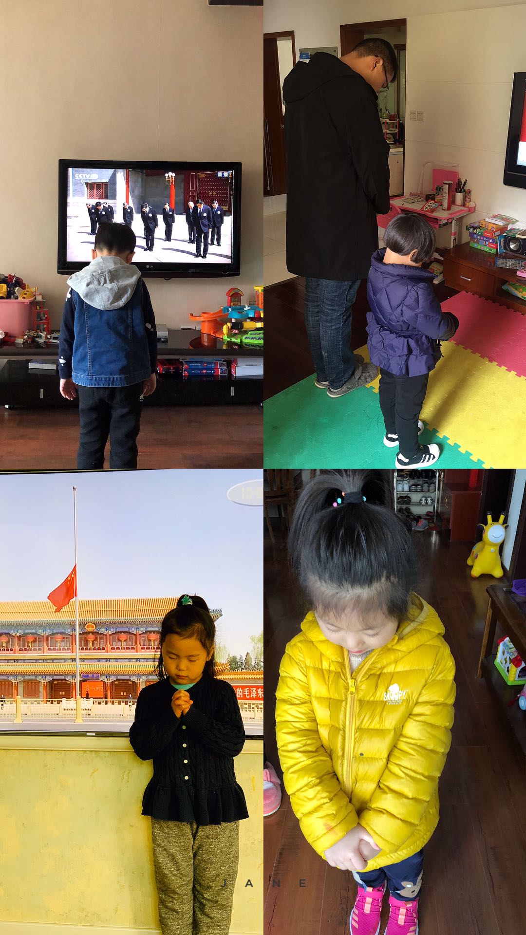同样因为疫情不能上班的教师们,放下手中的各种家务事默哀,表达抗击新冠肺炎疫情斗争烈士和逝世同胞的深切哀悼。