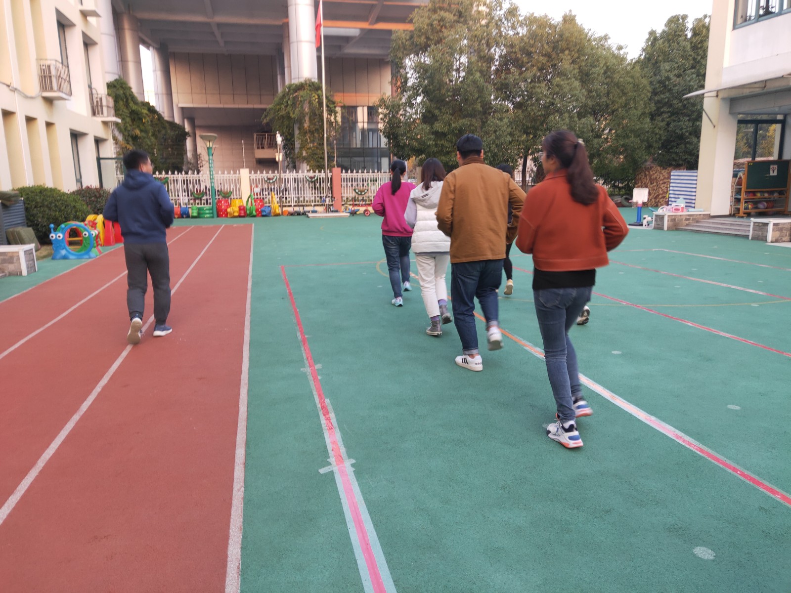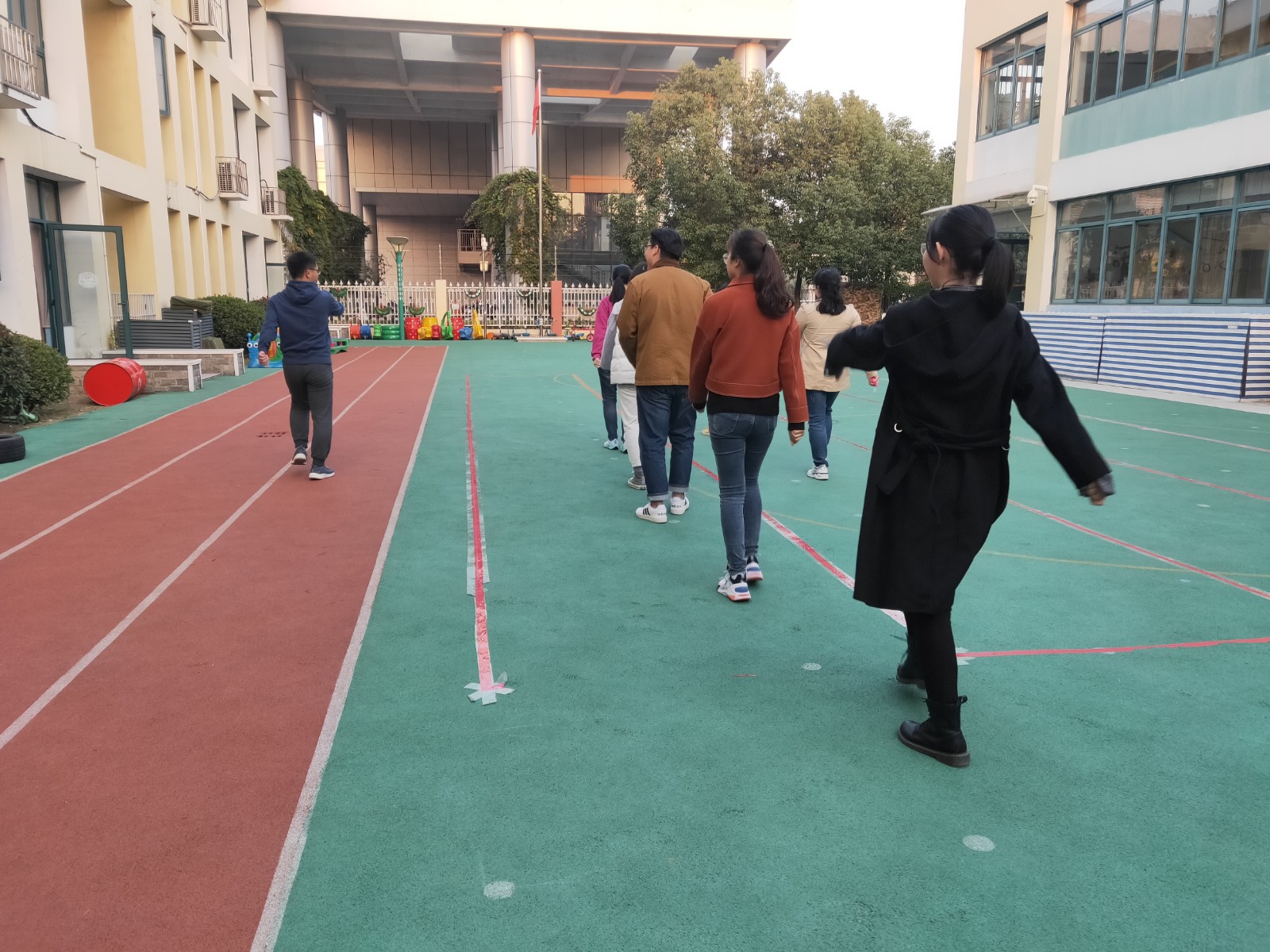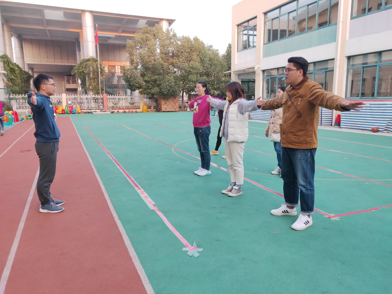 体育组组长孟珊珊老师强调,希望老师们把所学内容渗透到日常户外游戏和体育活动中去,在队形队列中实际运用起来。