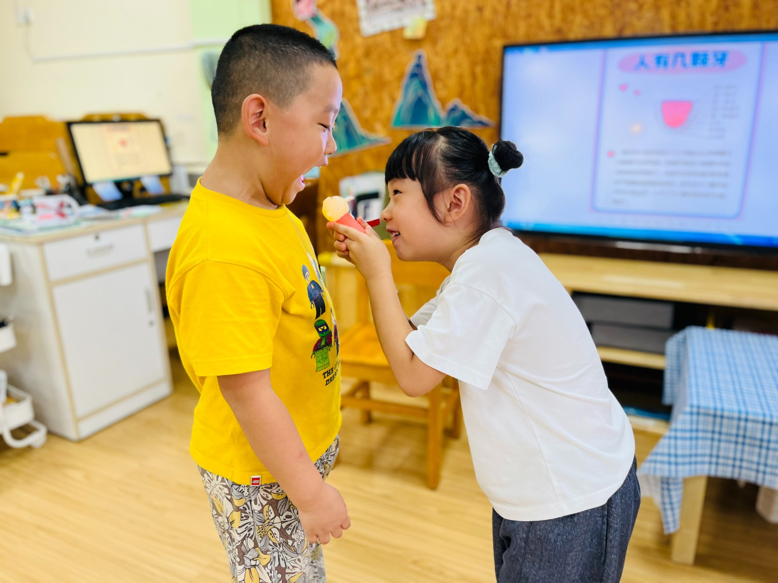 各班活动异彩纷呈,设置爱牙护牙小课堂,利用多媒体辅助教学,带领孩子们学习牙齿相关知识;观看牙齿主题小视频;认识牙刷,学习正确刷牙方法;鼓励孩子们自信微笑;玩“小牙医”角色游戏,两人一组张开嘴巴,相互检查是否有蛀牙;“我是牙齿小卫士”游戏,对错误的用牙习惯进行纠错练习等。