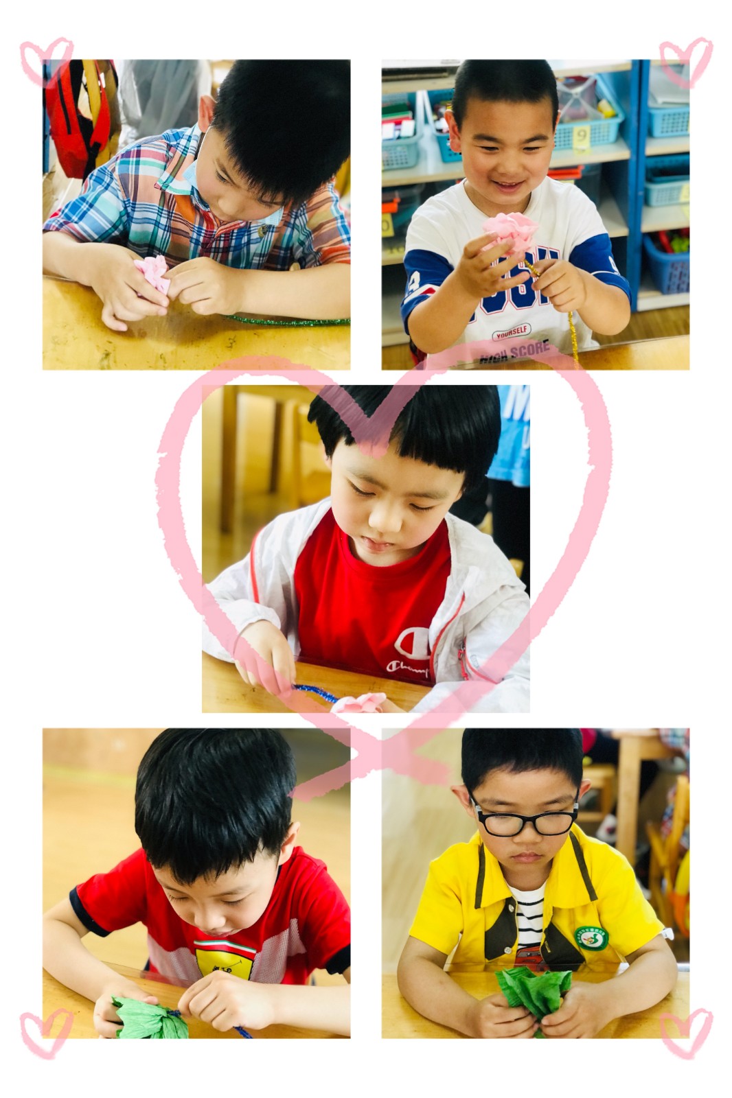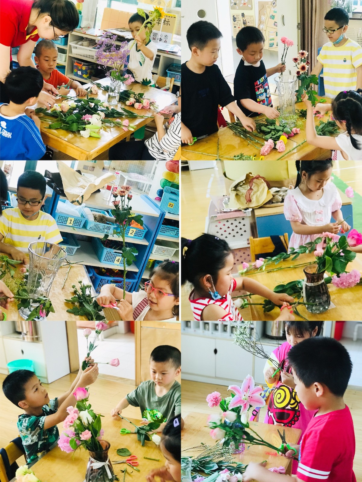 大一班和大三班孩子们希望将班级打扮的更加漂亮。经过激烈的讨论后确定:用五颜六色的花卉,制作成插花作品装点活动室。看,我们个个都是小小花艺师。