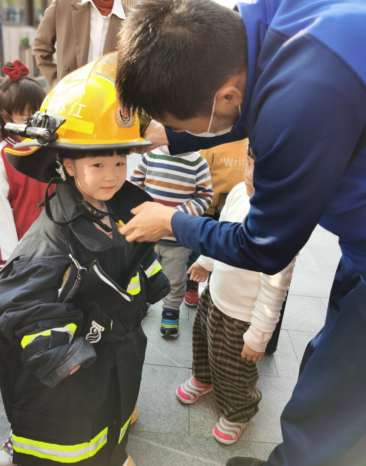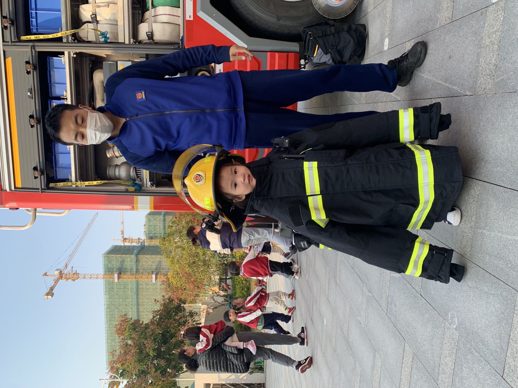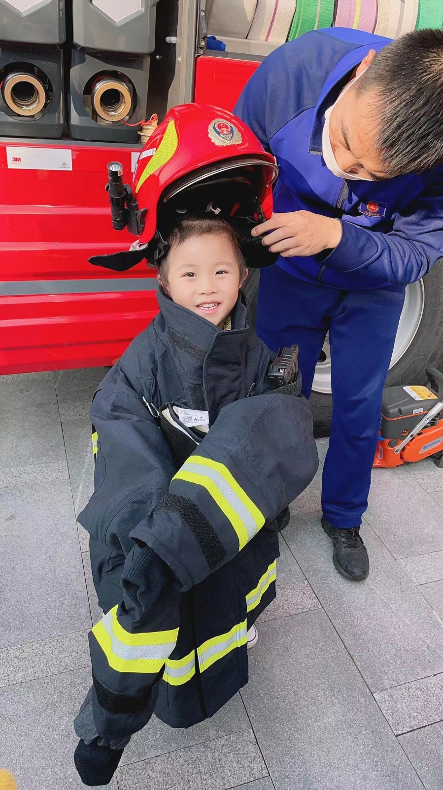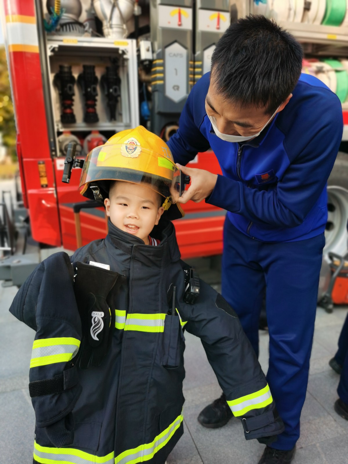 互动环节中,孩子们有的迫不及待地进入消防车进行“探秘”;有的则是穿上了消防服,在体验消防员神气模样的同时,也深深地体会到消防员叔叔实施救援工作时的辛苦。
