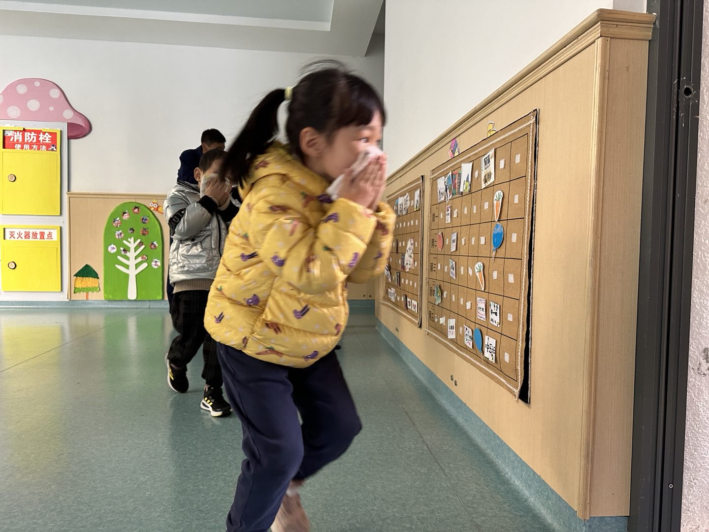 幼儿园内“浓烟弥漫”,阵阵急促的警铃响起,消防演练活动正式开始。只见孩子们手拿湿巾捂住口鼻,在老师和消防员叔叔的带领下有序地弯腰快步下楼,安全且迅速的来到空旷场地。