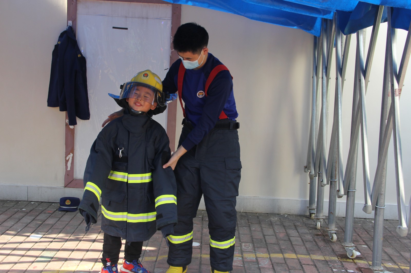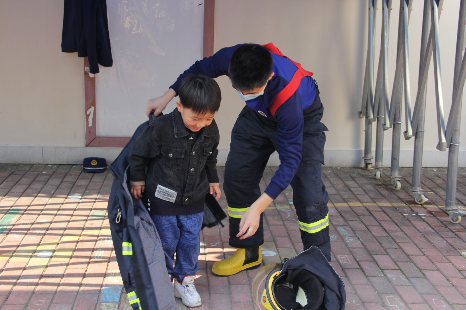一名消防员叔叔向我们展示了消防服的正确穿戴步骤,之后在消防员叔叔的指导下,小朋友也纷纷尝试穿上消防服、戴上消防帽,亲身体验消防服带来的闷热与负重感,感受消防员工作的辛苦。