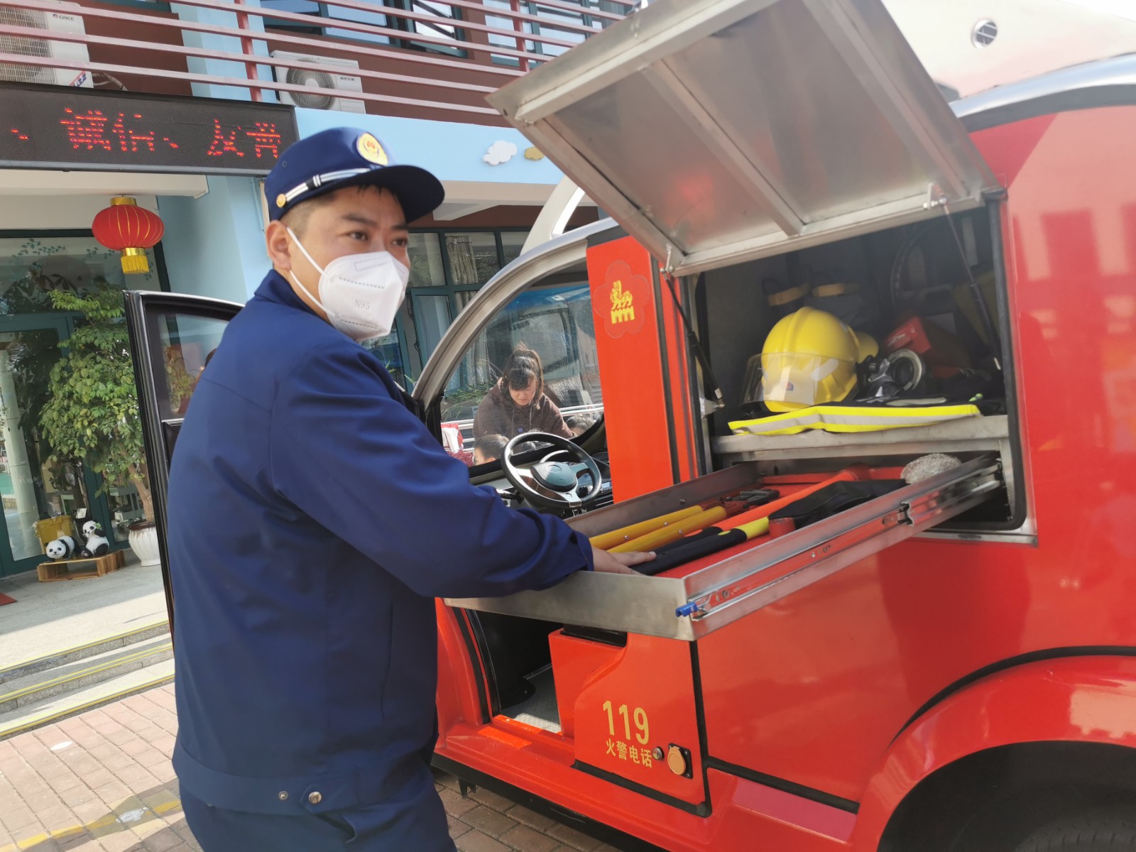 消防员叔叔在孩子们的欢呼声中将消防车的储备门打开,消防车虽小,但小小的肚子里面很多消防器材:发动机、抽水泵、灭火器、高压水枪、消防水管、隔热服、氧气罩等,另一面还有一块播放消防宣传知识的屏幕。小朋友们认真的聆听消防员叔叔介绍,小班的弟弟妹妹还幸运地乘坐了消防车,当了一回消防车小司机。