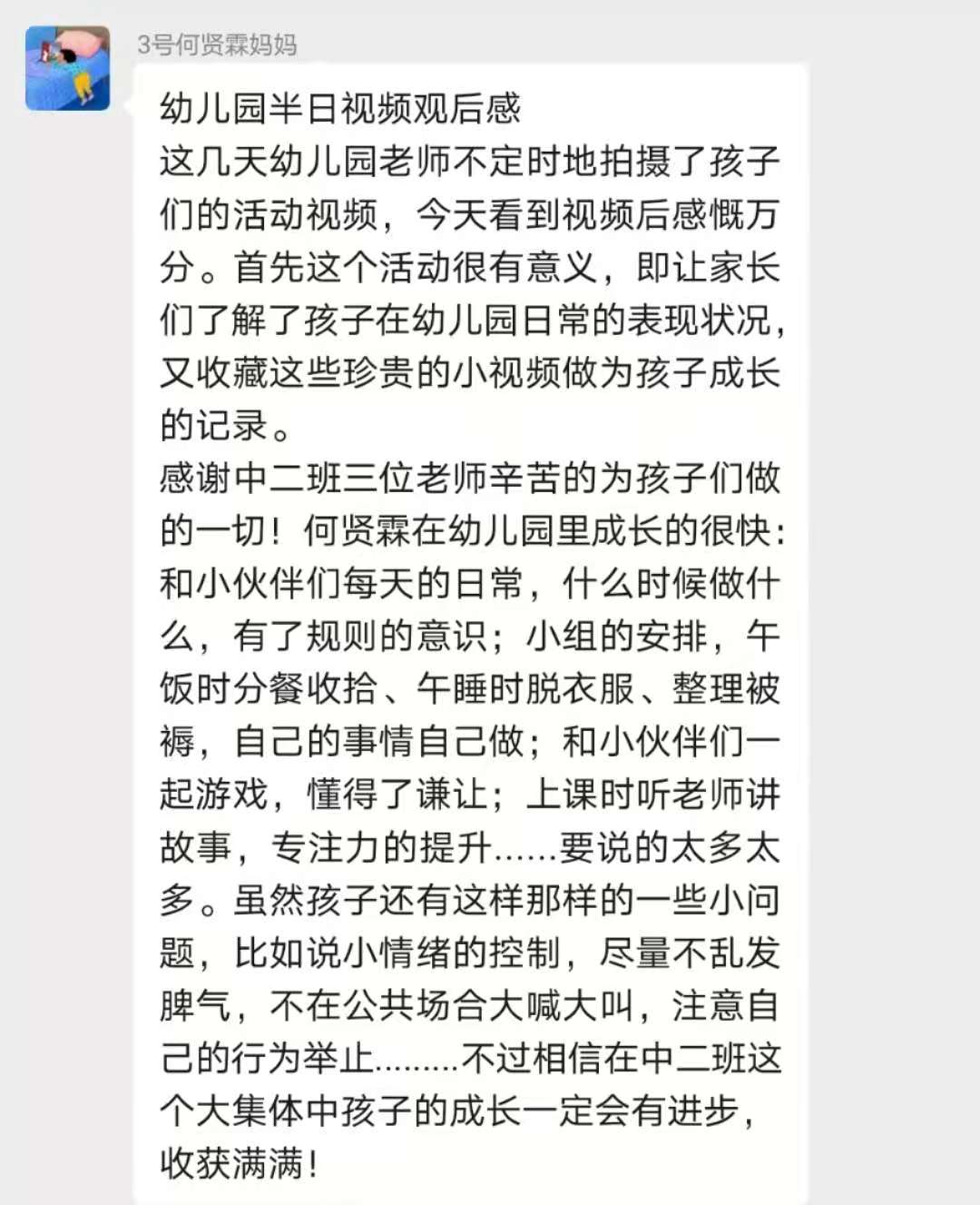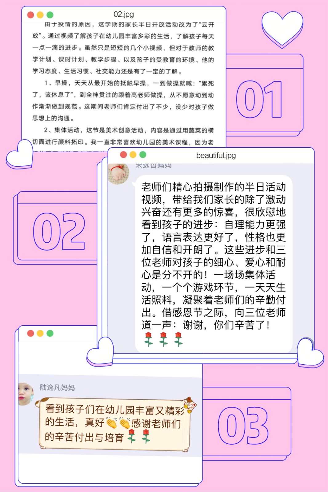 本次线上半日开放的分享活动,让家长更多、更充分地了解到孩子在幼儿园的一日活动情况,通过一个个细微的环节,深刻感受到了教师的辛劳和对孩子满满的爱。同时也对幼儿园的工作有了客观的认识,提升了家园之间的沟通力度,拉近了幼儿园与家长的距离,为家园共育搭建起了交流的平台!