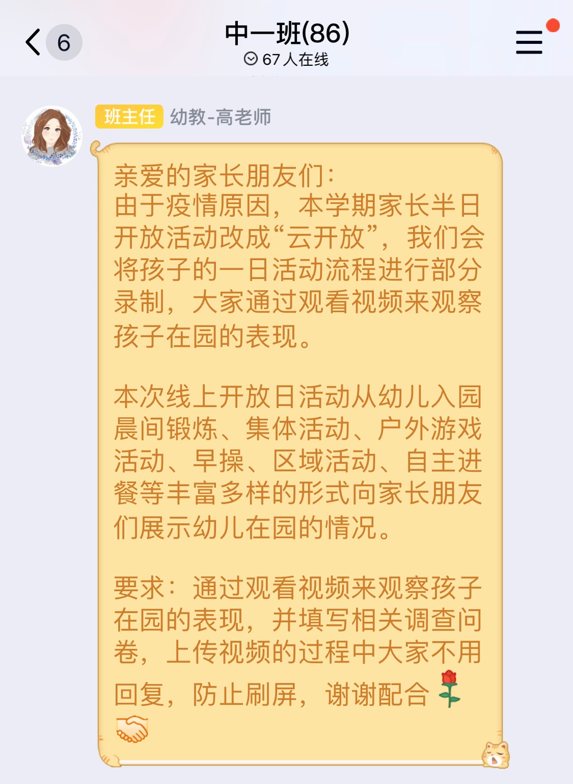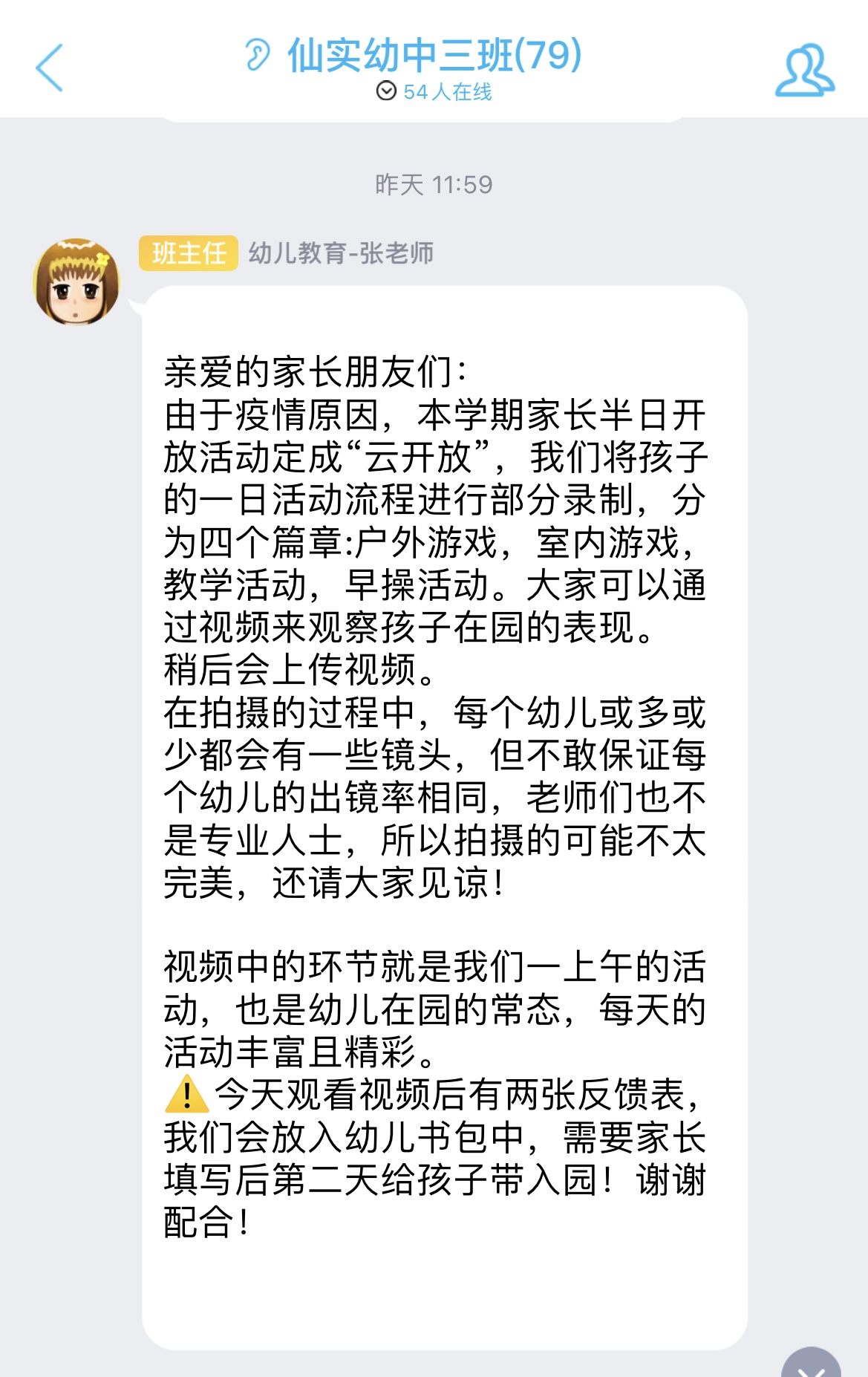 的形式向所有家长分享幼儿在园的一日生活。线上活动的方式既避免了人群的聚集,又能在不影响幼儿活动秩序的情况下让家长们更直观的看到幼儿在园丰富多彩的生活。