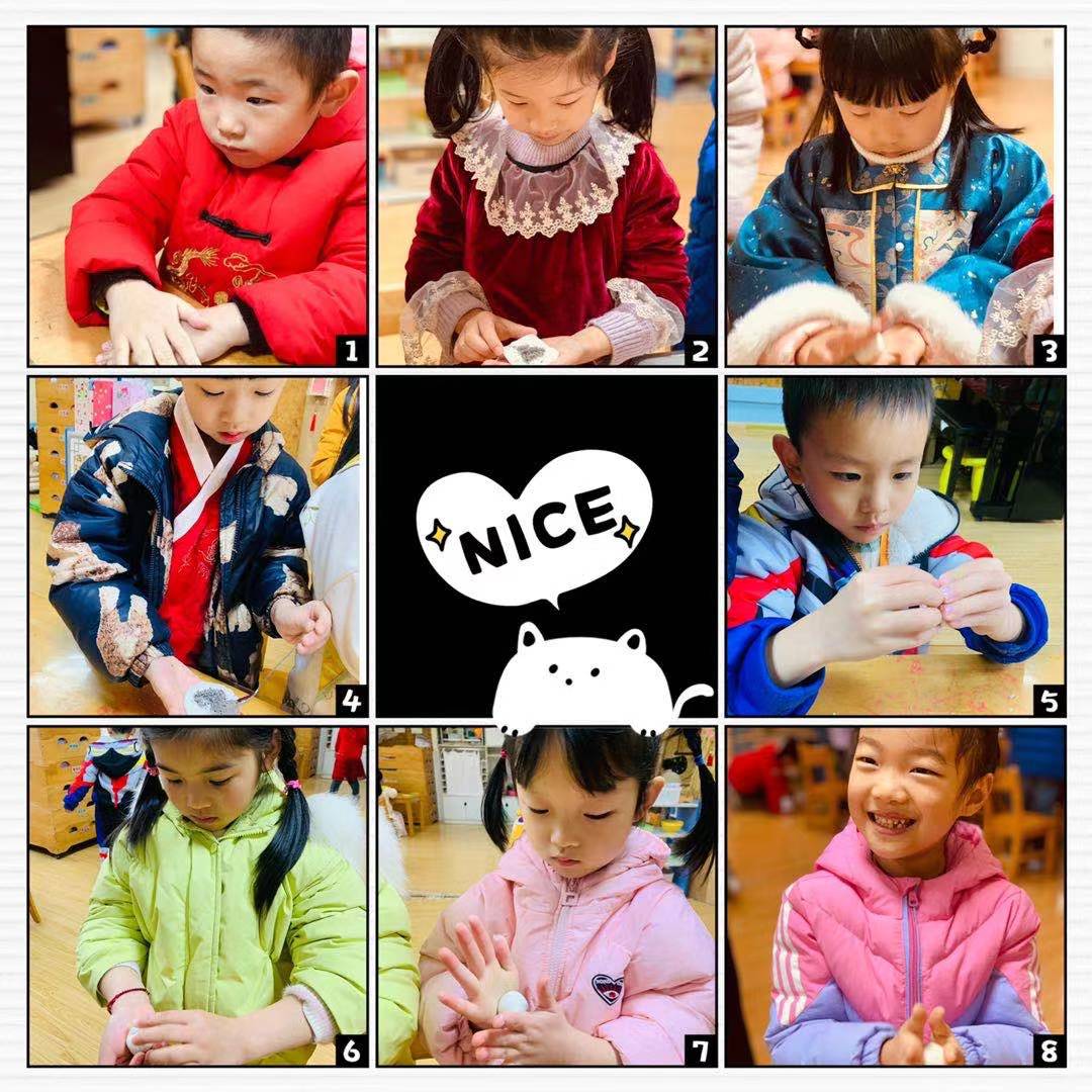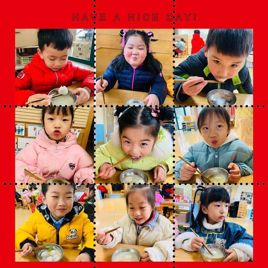 元宵节自然少不了元宵这位主角啦,小朋友在老师们的组织下,通过”说汤圆、做汤圆、尝汤圆”了解整个做汤圆的过程:揉面、搓圆、按压、放馅、捏紧。动作虽显稚嫩但热情高涨,不一会儿,一盘盘圆滚滚的元宵就搓好啦。下午点心时间终于到啦,看着一碗碗自己做的元宵心里美滋滋的,津津有味地品尝着自己的劳动成果,欢乐的笑脸洋溢在每个孩子的脸上。