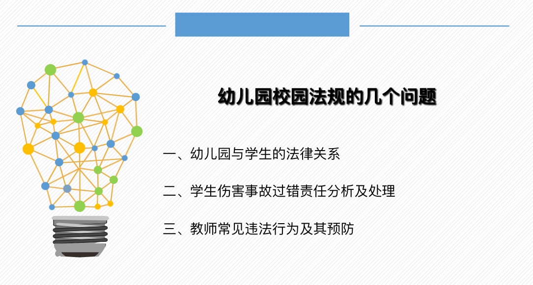 讲座围绕幼儿园与幼儿的法律关系、幼儿伤害事故过错责任分析及处理等几方面对全体教职工进行了法制知识的培训,并结合幼儿园容易发生的安全事故展开分析,向大家介绍了作为幼儿园教育者该如何充分尽到教育、管理及保护的义务,以案说法,让大家了解幼儿园安全管理的重要性,以及发生事故时该如何妥善处理和怎样运用法律手段保护自己,合理地维护自身合法权益,提高教师对安全法律的认识,树立法的观念,真正做到学法、知法、懂法、守法。