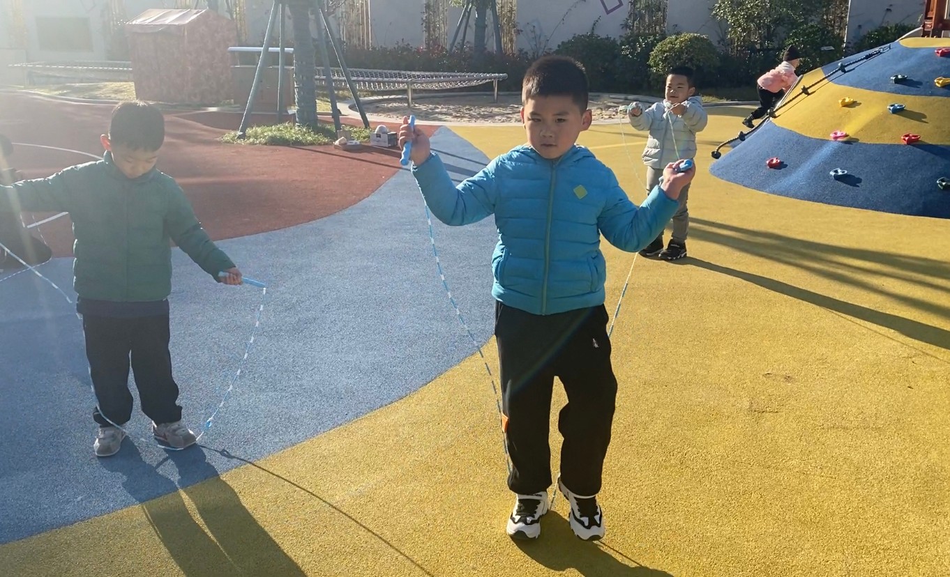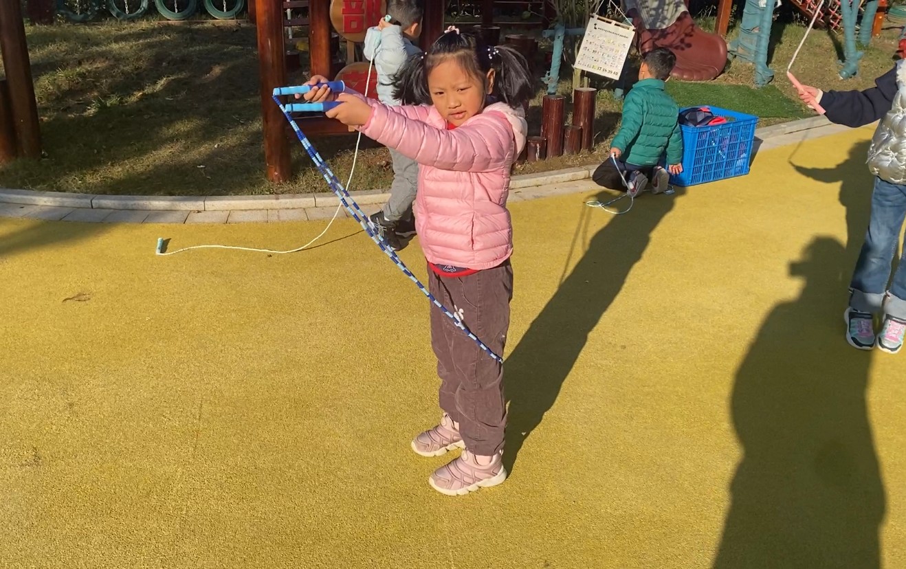 一根小小的绳子,连接的是快乐和运动。根据《指南》《纲要》的具体要求,为了培养幼儿对体育活动的兴趣,大班组在体育节里展开了跳绳小健将的活动。比赛开始后,孩子们轻快地挥舞着手中的彩绳,脚尖轻盈地弹跳,各个“绳”彩飞扬。